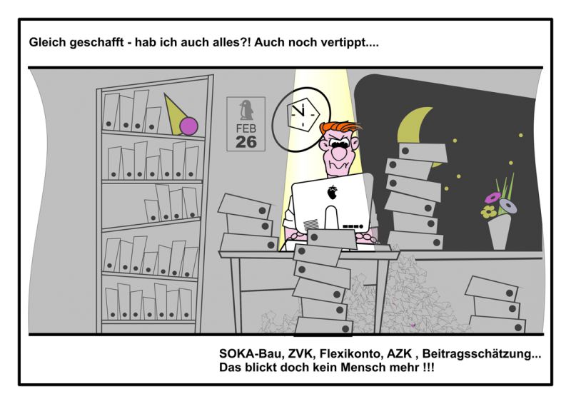 Alle Besonderheiten im Baulohn – wie Meldungen an die SOKA-Bau oder ZVK, Urlaubsgeldabrechnung, Winterbeschäftigungsumlage, Abrechnung von Saison-Kurzarbeitergeld, Führen von Arbeitszeitkonten, etc. um nur einige davon zu nennen, sind Bestandteil meiner monatlichen Arbeit.